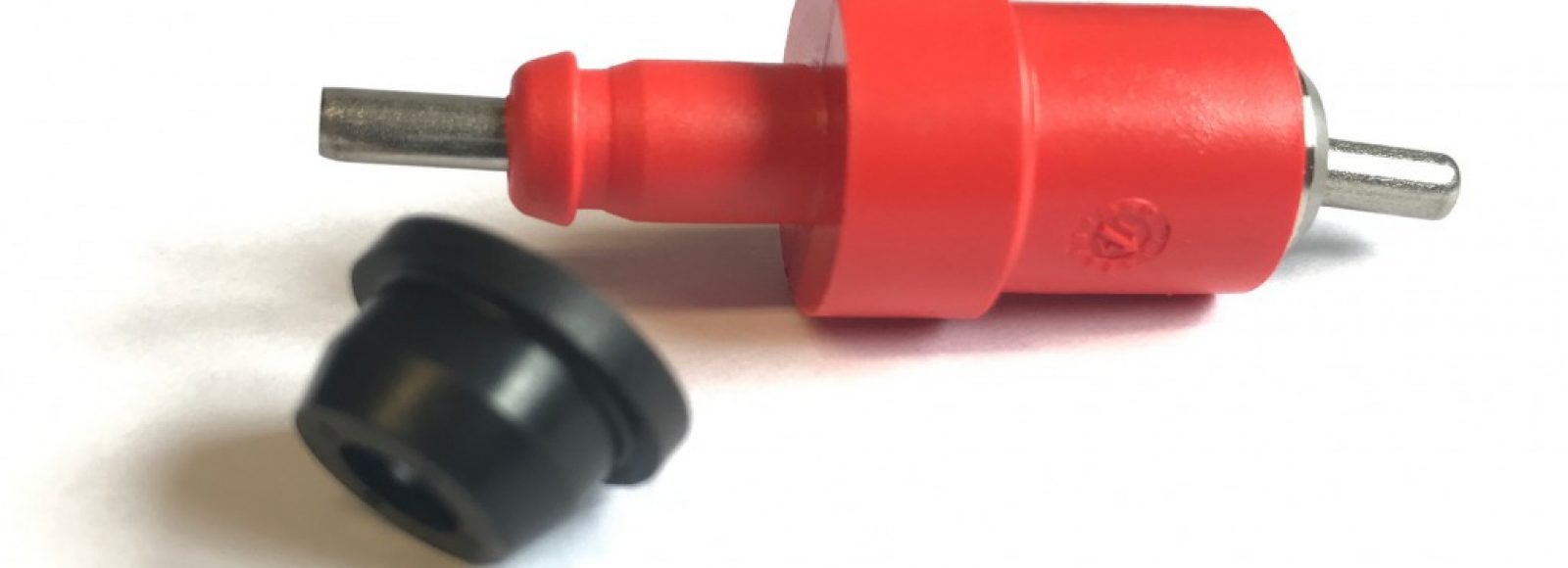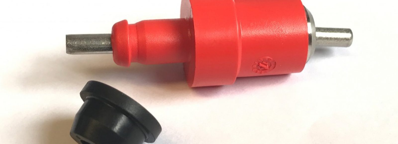Poultry nipples with 360° side-action pin, red Delrin outer body. A metering pin gives a constant water flow. Closed by both a stainless steel ball and pin in s/s seating.