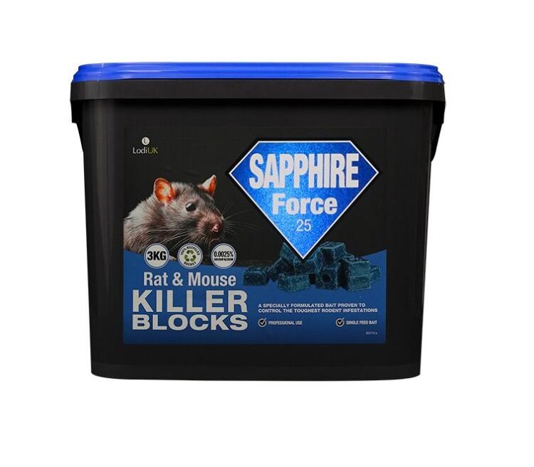 A unique and highly attractive bait for use by professionals that can kill rodents in a single feed. Sapphire Bait Blocks Force 25 combine premium grade cereals with enhanced attractants, ensuring unparalleled effectiveness even in the most challenging environments, both inside and around buildings.